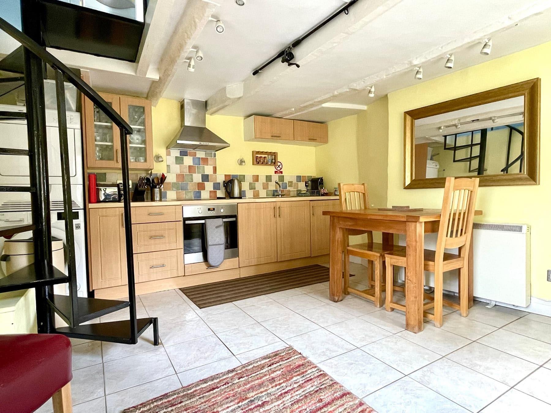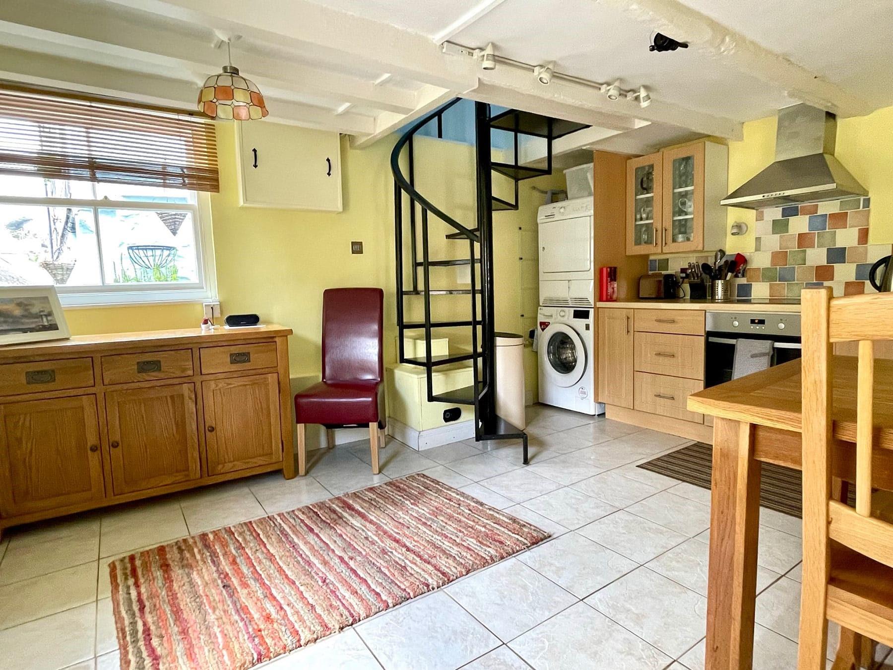 electric oven and hob, fridge, washing machine, and dining table for two. Spiral staircase leading to:
