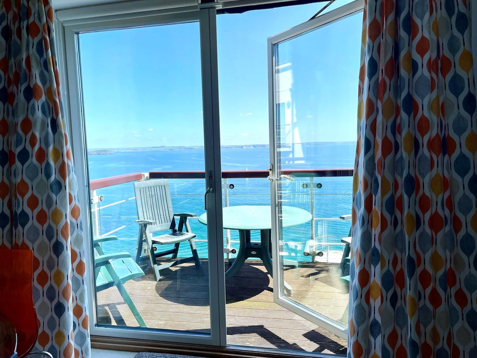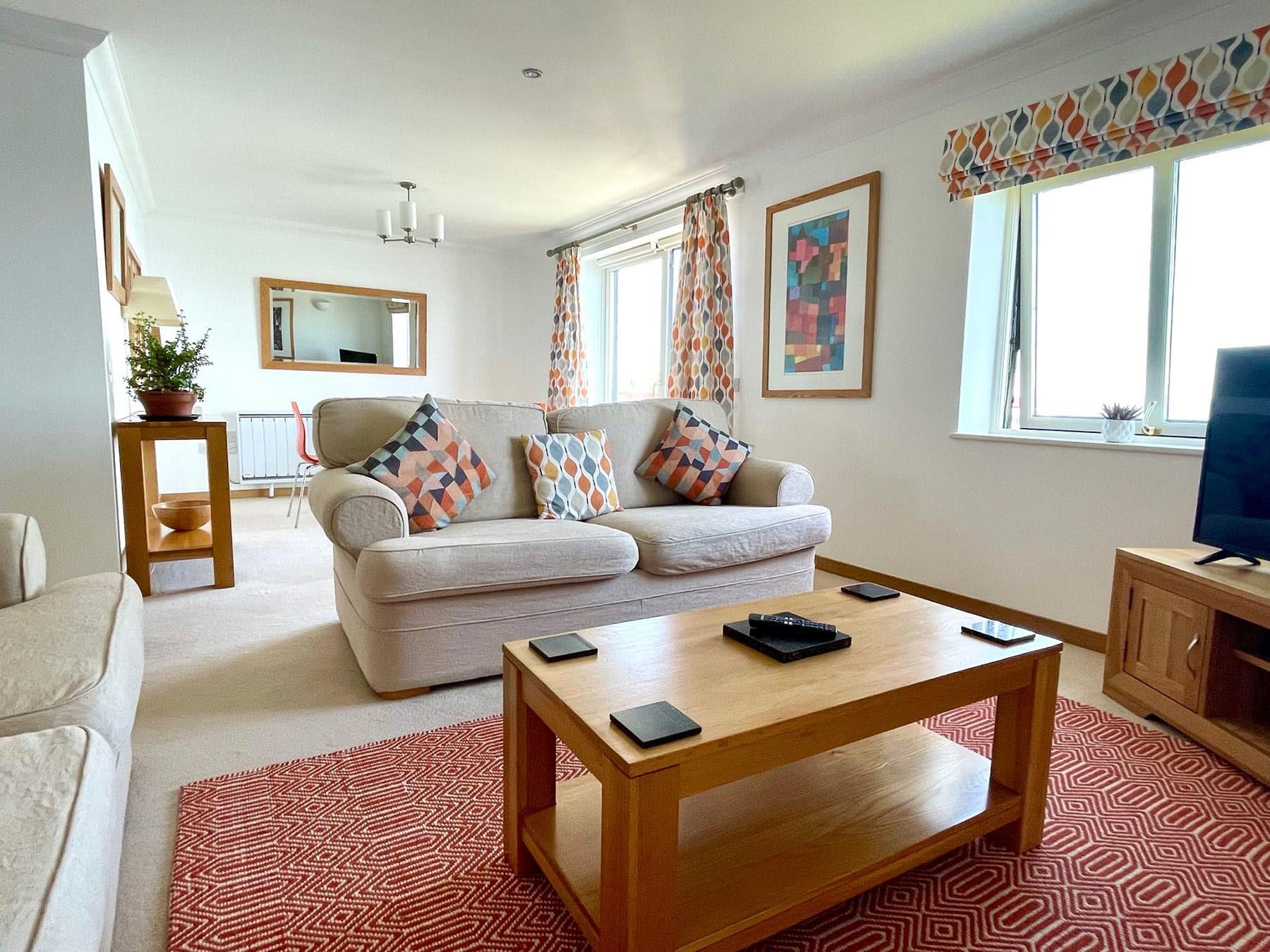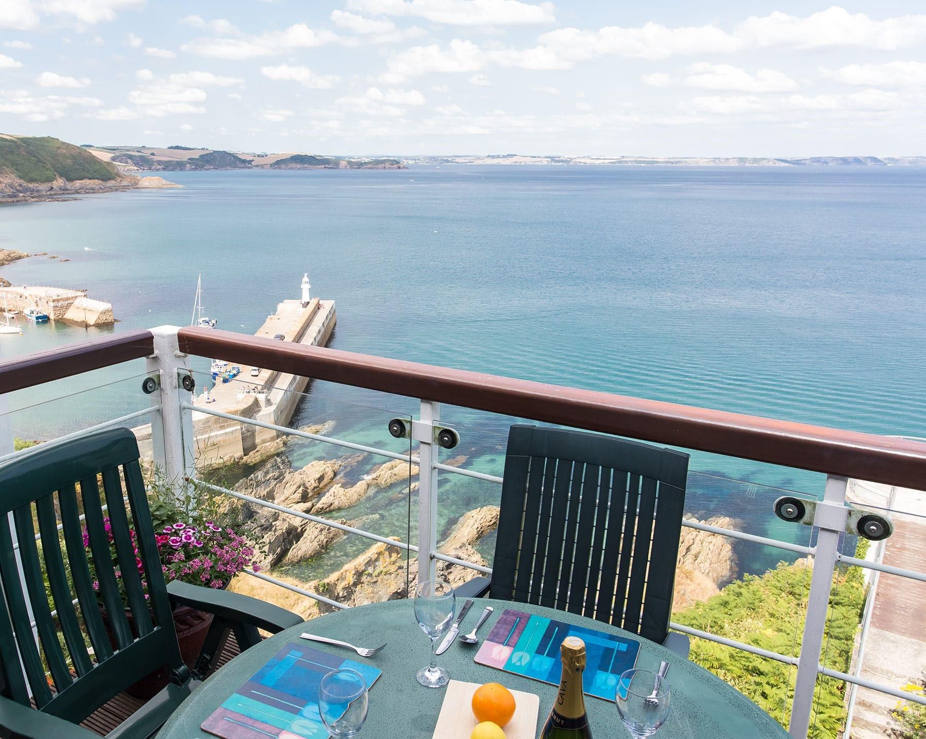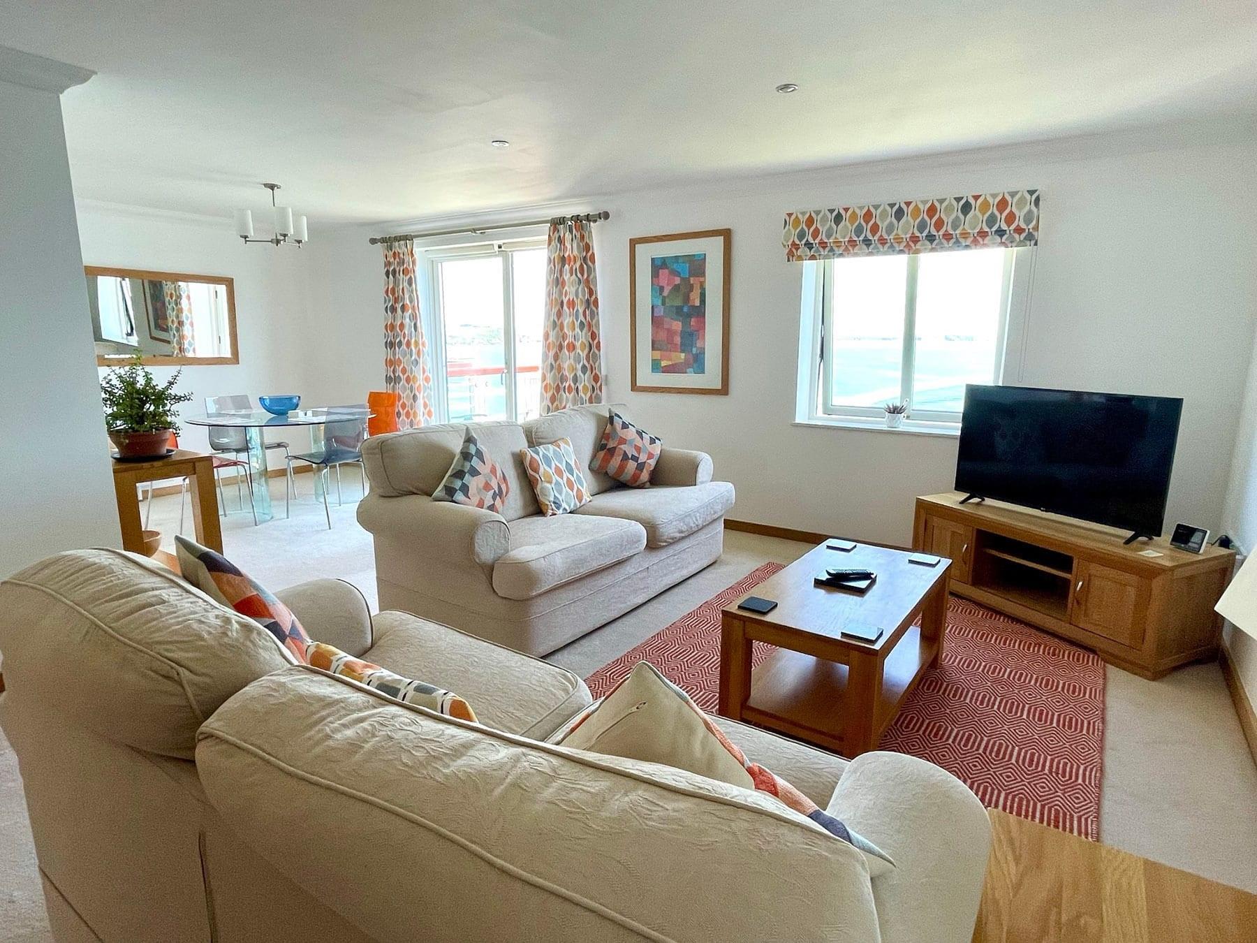 fantastic views of Mevagissey Bay, with French doors that open onto the balcony with table and seating, two sofas, Smart TV, dining table and four chairs.