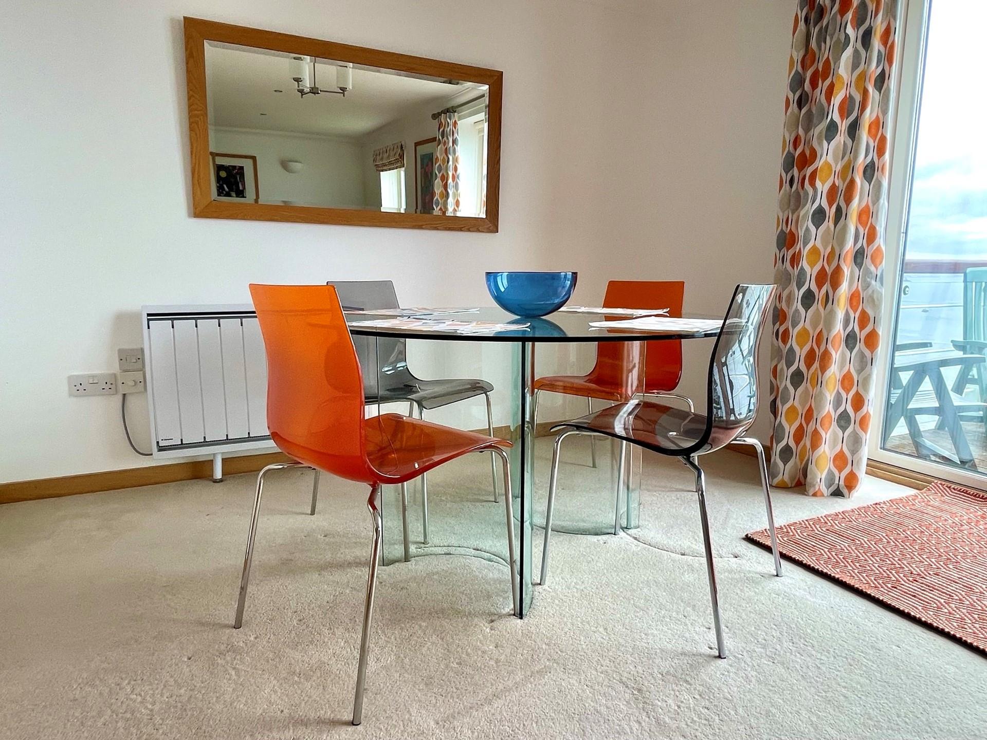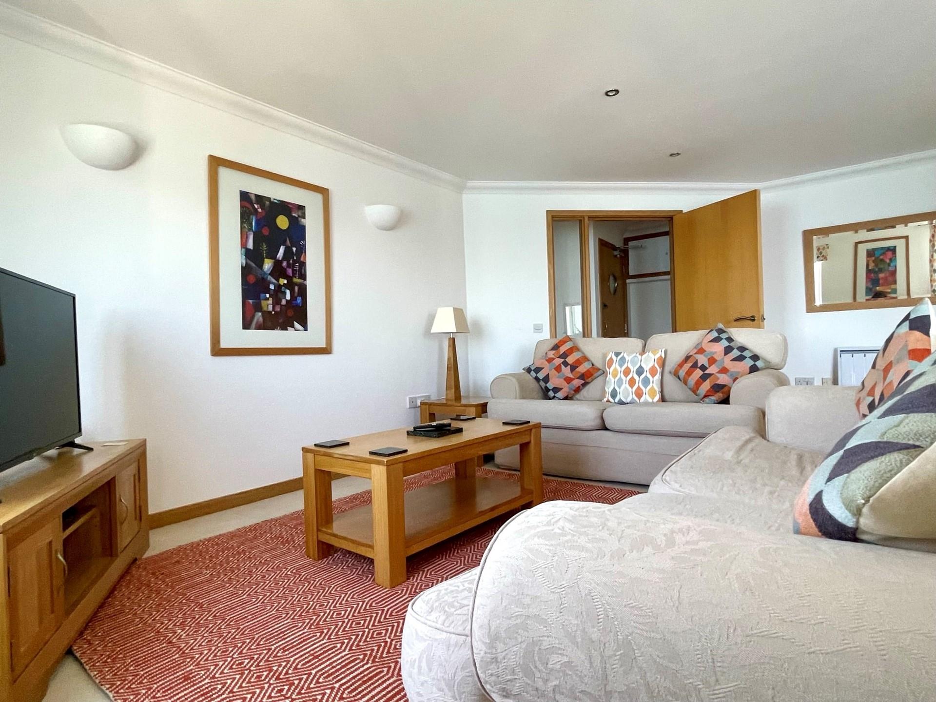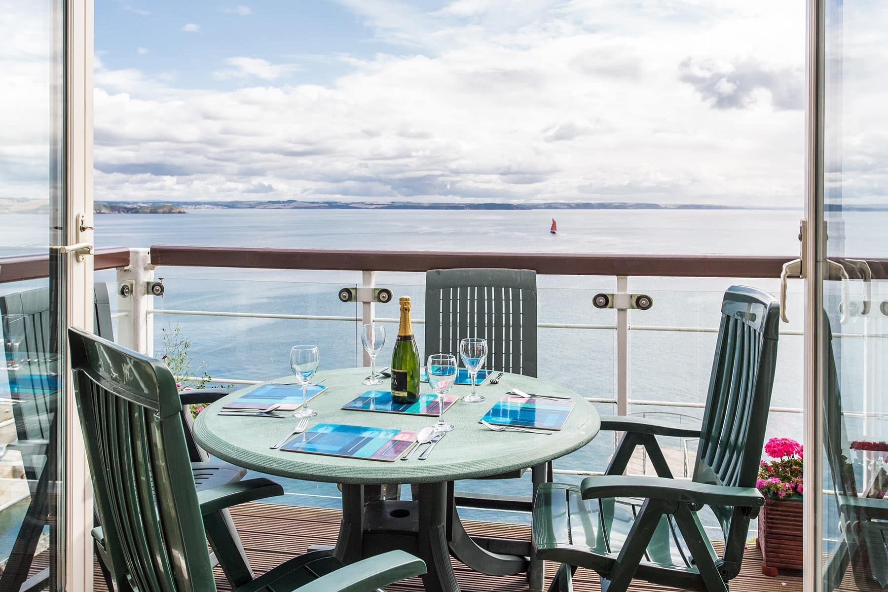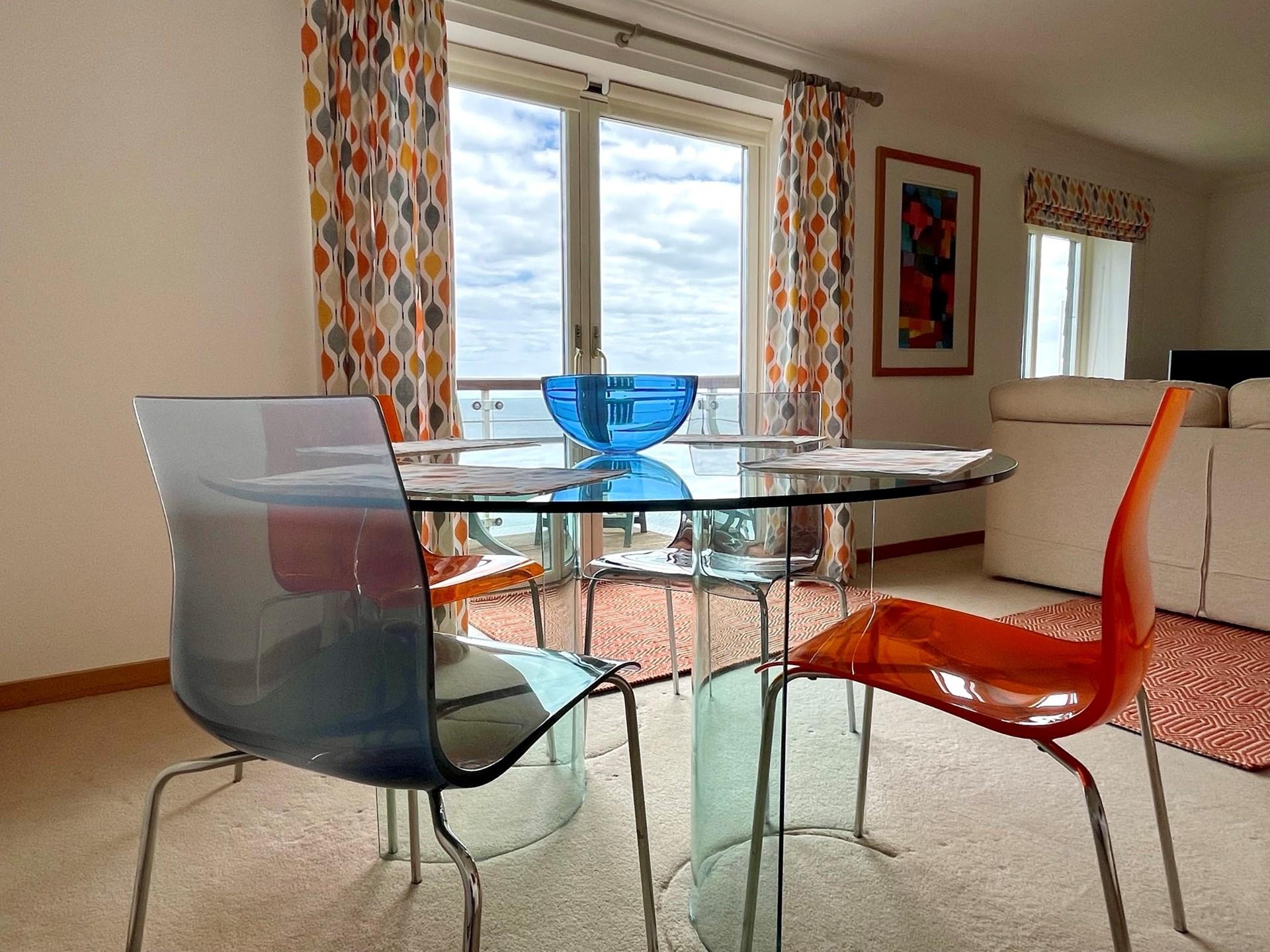 fantastic views of Mevagissey Bay, with French doors that open onto the balcony with table and seating, two sofas, Smart TV, dining table and four chairs.