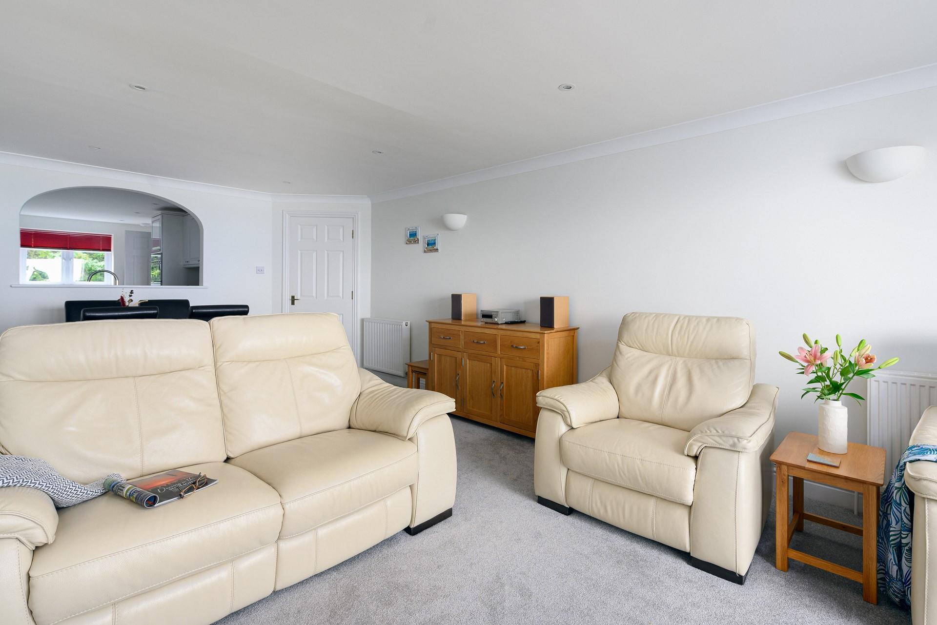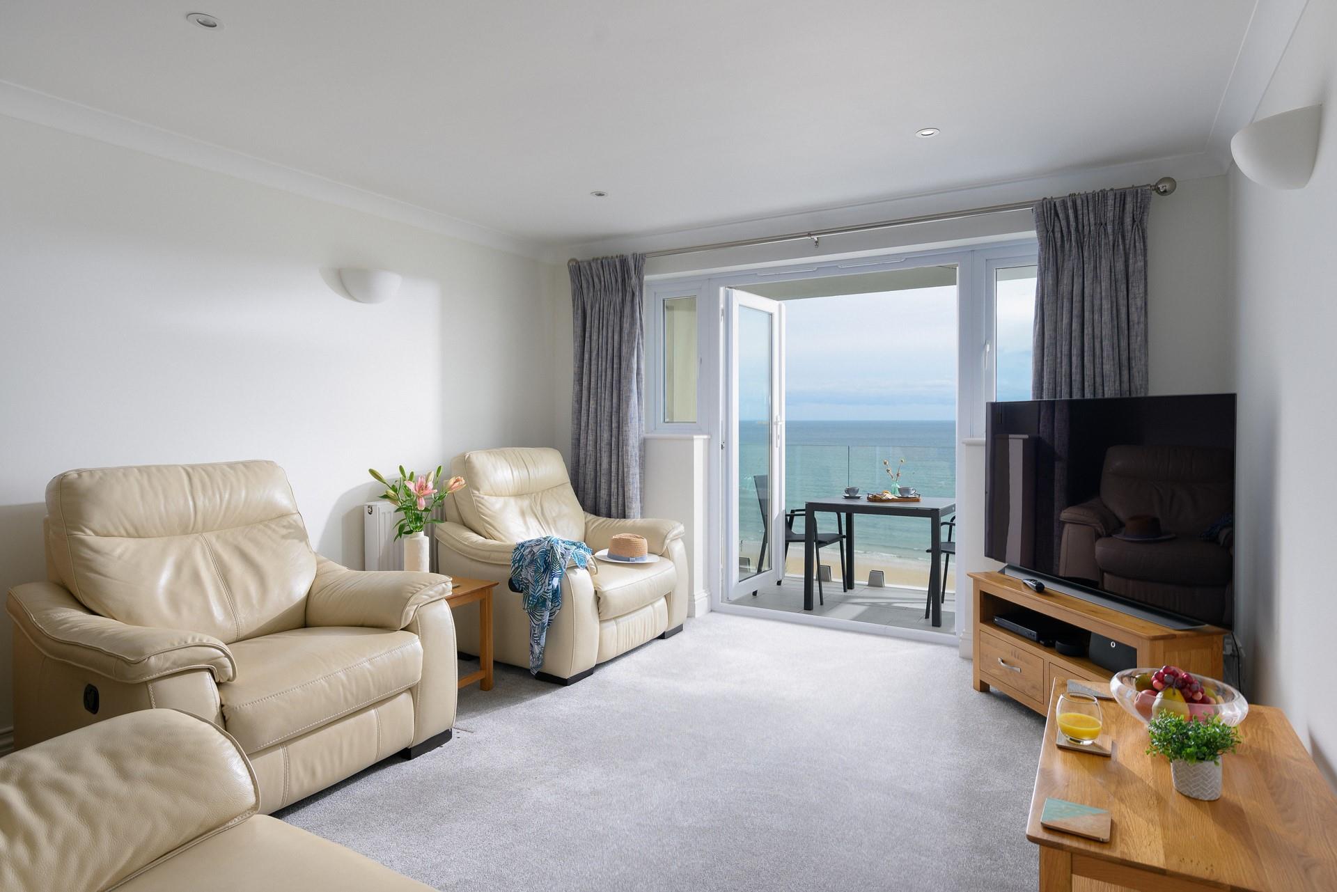 dining table and chairs, two seater electric recliner sofa and two recliner armchairs, OLED Smart TV/DVD, Blu-ray, Netflix, Amazon Alexa, sea views, French doors to balcony with patio furniture and spectacular sea views.