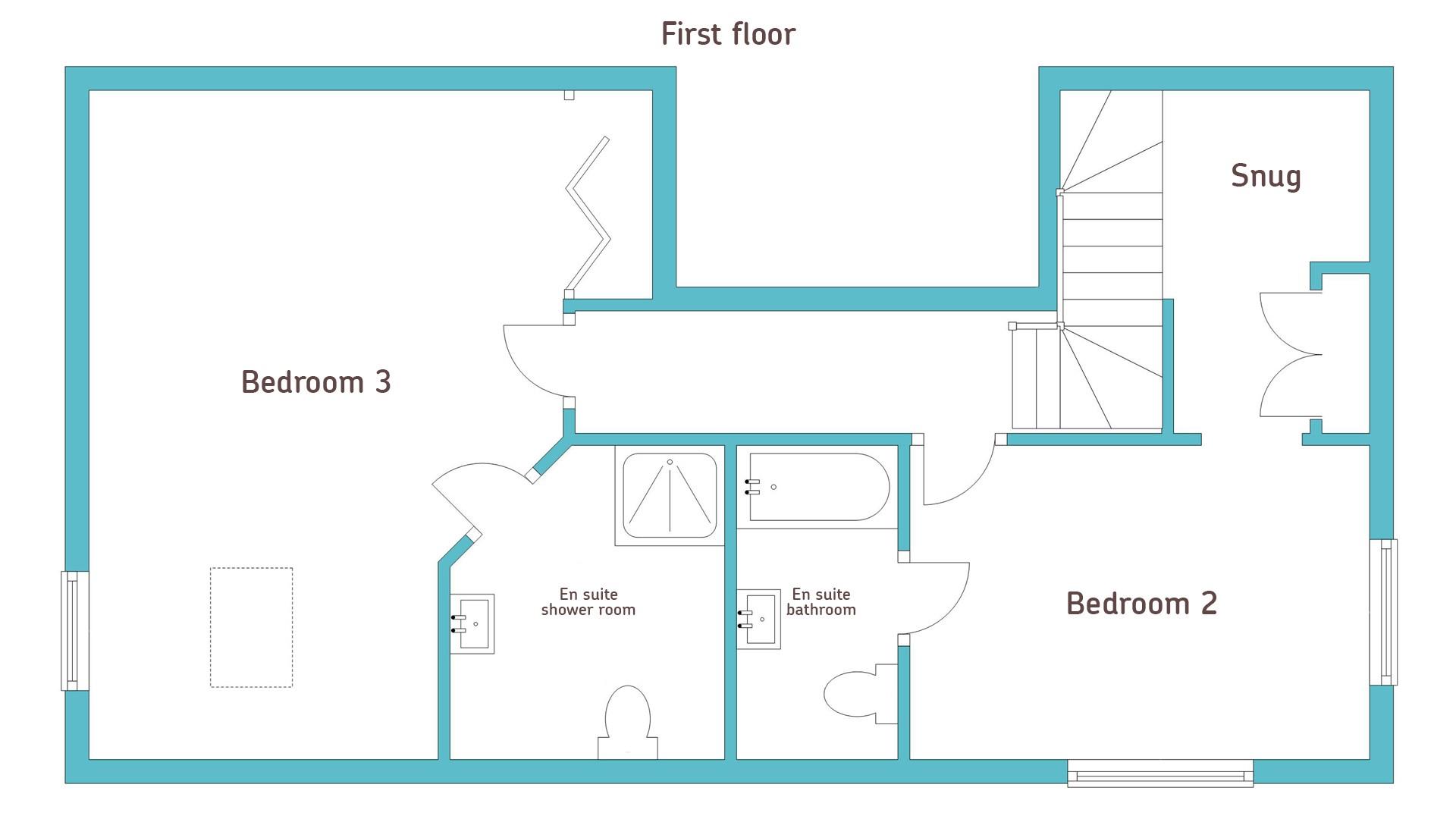 zip and link (twin or super king size) beds, TV, chair, snug area (restricted headroom) with two bean bags, TV, en suite with bath and shower over, WC, basin.