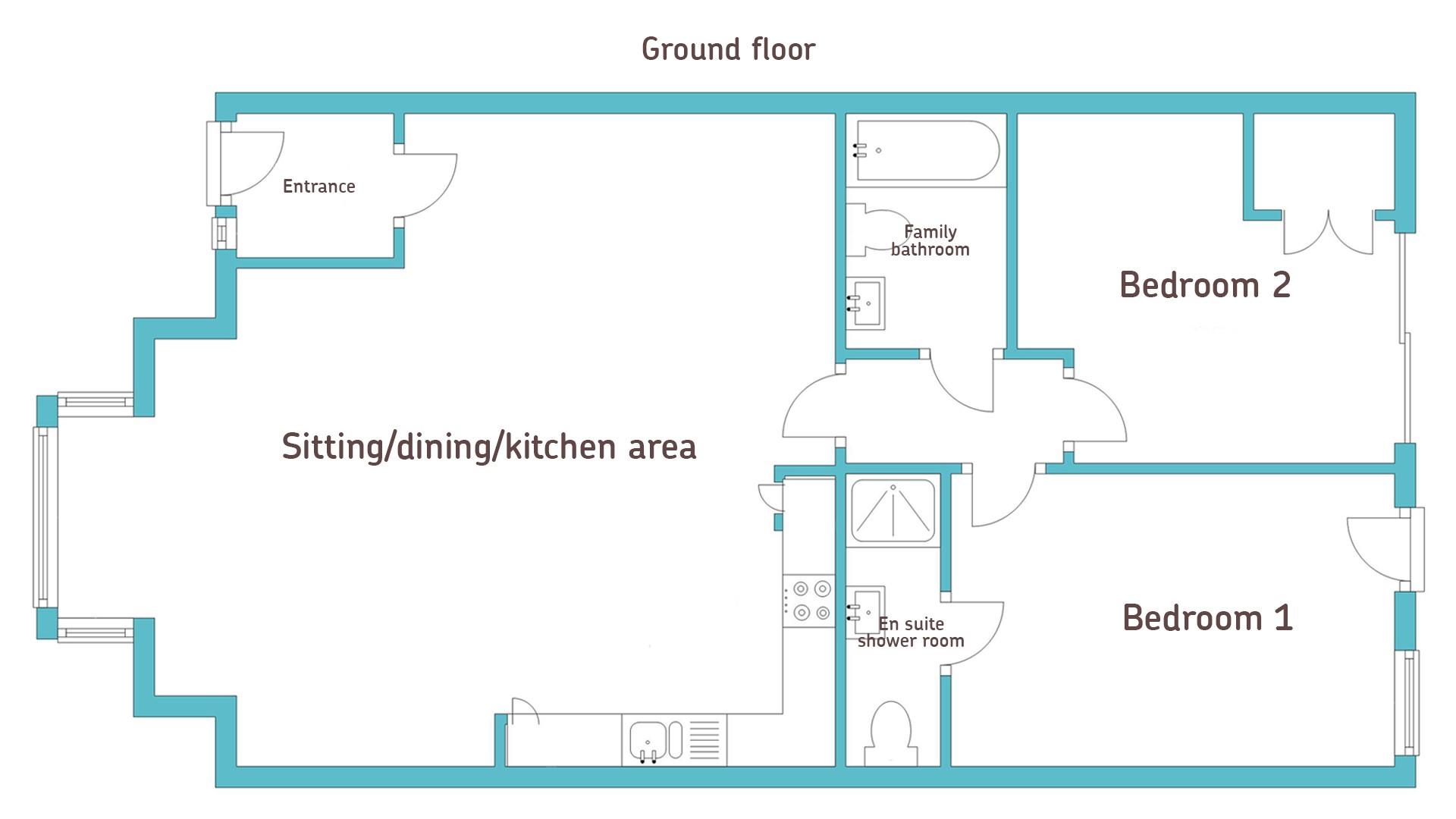ground floor apartment with no external steps on one level, with step into ensuite shower.