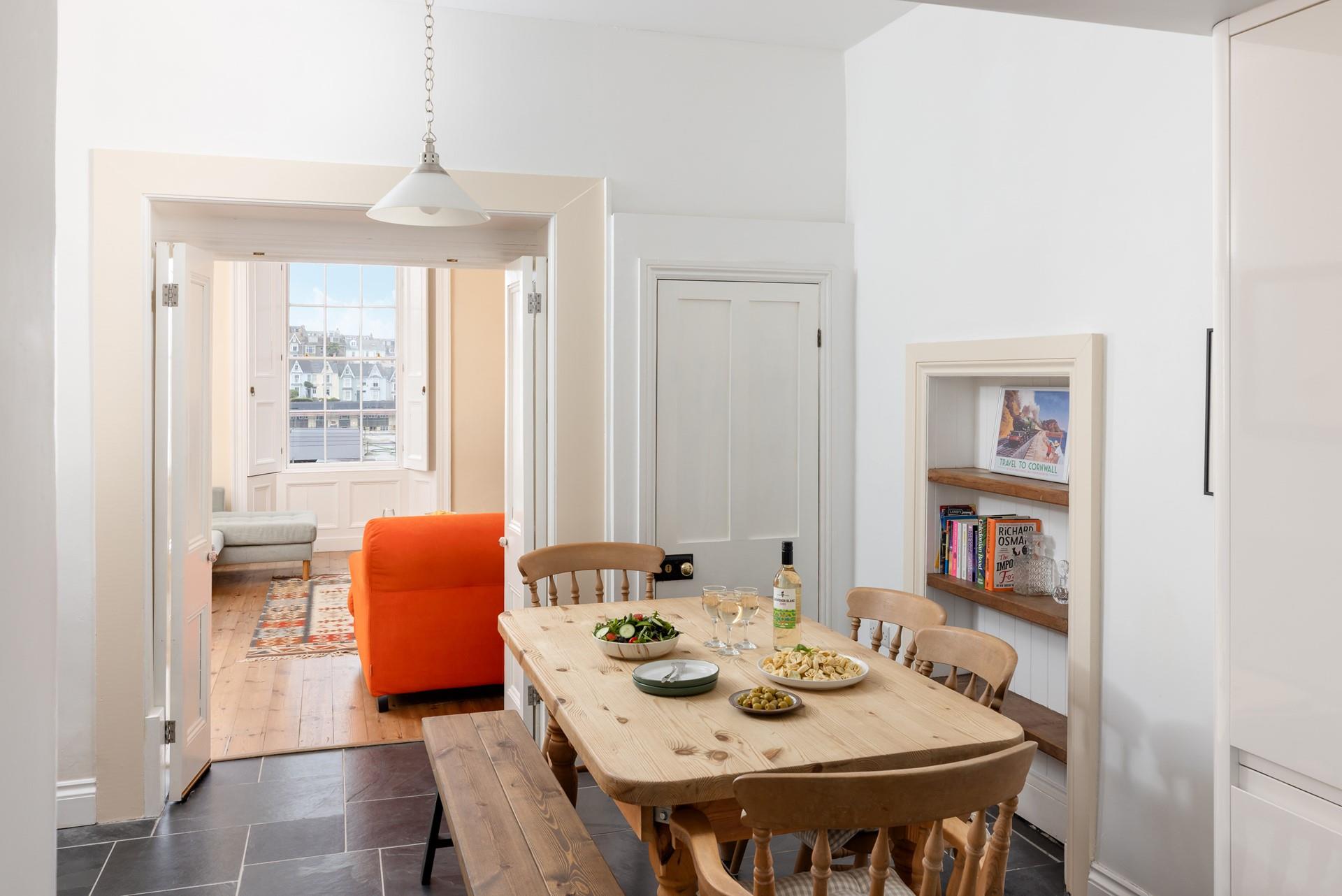 dining table and chairs, shelving with a selection of books.