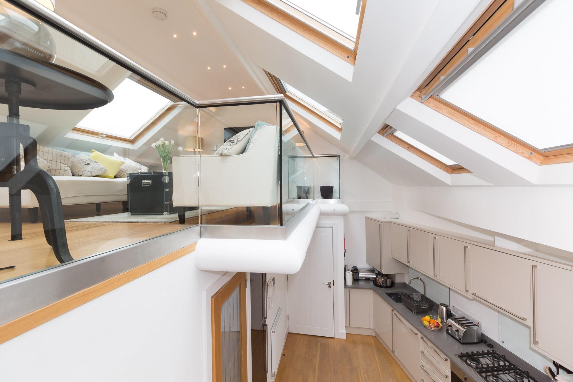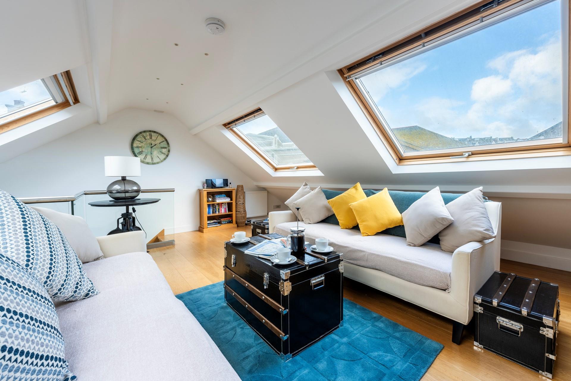 The Porthole is a beautiful, two-bedroom duplex apartment close to the centre of St Ives town. Its sought-after location allows you to explore the town on foot with ease, from its five sandy beaches to its bustling shopping streets and many local, family-owned restaurants. There is so much to do nearby with all ages and weathers catered for. The world famous art destinations of Tate St Ives, the Barbara Hepworth Museum and Leach Pottery are all within a ten minute walk of the apartment while the nearby harbour is the perfect place to enjoy a stroll or a Cornish gin, cider or beer while watching the changing tides. It is also the starting point for boat trips along the coast to Seal Island where you might also be lucky enough to spot a dolphin or two. If you fancy an evening in, dine together around the family dining table before heading upstairs to the comfortable, galleried sitting room. Open the large Velux windows for views out across the rooftops to the sea and Godrevy Lighthouse before settling down for a family evening - with board games, and a PlayStation all provided to keep everyone entertained.